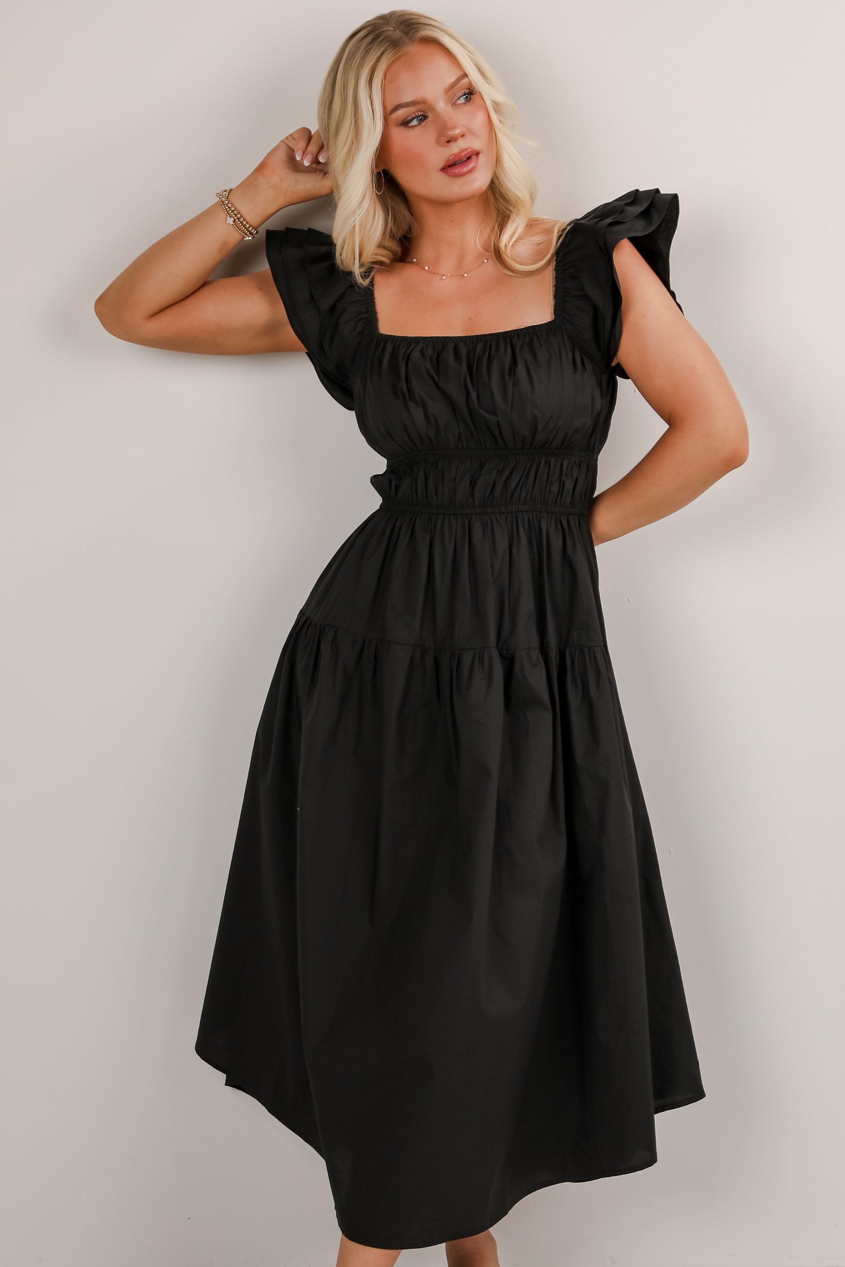 Be it martini or mai tai, the Came For Cocktails Black Maxi Dress pairs so well with a drink in the hand! This effortlessly elegant dress features a flattering silhouette with a relaxed fit, soft flutter sleeves, and a breezy, lightweight fabric that moves beautifully with every step. The maxi length adds a touch of drama, while the timeless black hue keeps it classic and versatile. Whether you’re headed to a special event or a sunset dinner, this dreamy dress is your go-to for looking chic and feeling comfortable! Lightweight Cotton Fabrication Elastic Square Neckline Elastic Shoulders Short Flutter Sleeves Elastic Waistband Flowy Fit Maxi Length Lined Body, Unlined Sleeves Self + Lining: 100% Cotton Hand Wash Cold, Hang or Line Dry Model is 5’6″ and wearing a Small.Garment Measurements in Inches:Small | Bust 30″ | Waist 26″ (Stretches up to 30″) | Hips 32″ | Length 49.5″Medium | Bust 32″ | Waist 28″ (Stretches up to 32″) | Hips 34″ | Length 50″Large | Bust 34″ | Waist 30″ (Stretches up to 34″) | Hips 36″ | Length 50.5″X-Large | Bust 36″ | Waist 32″ (Stretches up to 36″) | Hips 38″ | Length 51″