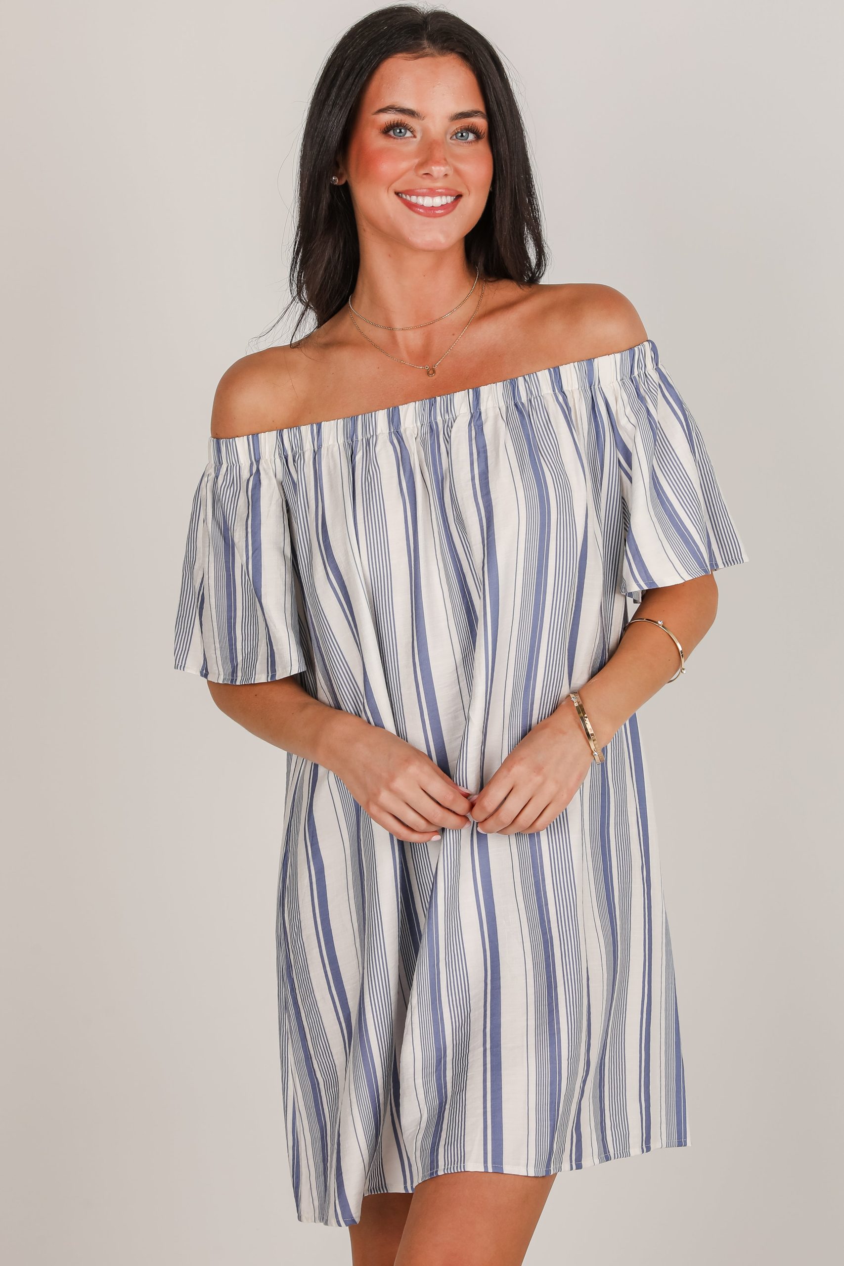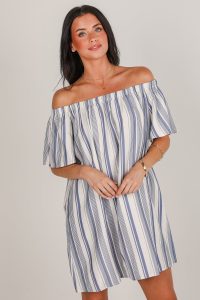 An effortlessly romantic day includes the Just A Theory Blue Striped Mini Dress! Featuring classic vertical stripes in crisp blue and white, this dress is designed with flutter sleeves for a soft, feminine touch. The mini length adds a flirty vibe, while the lightweight fabric keeps it breezy and comfortable all day long. Ideal for brunch dates, weekend outings, or seaside strolls, this dress is a go-to for effortless summer style! Lightweight Woven Knit Fabrication Striped Print Elastic Square Neckline Can Be Worn On or Off The Shoulder Short Flutter Sleeves Flowy Fit Short/Mini Length 85% Rayon, 15% Nylon Hand Wash Cold, Hang or Line Dry Models are 5’0″ + 5’4″ and are wearing a Small.Garment Measurements in Inches:Small | Bust 36” | Waist 48” | Hips 52” | Length 32”Medium | Bust 38” | Waist 50” | Hips 54” | Length 33”Large | Bust 40” | Waist 52” | Hips 56” | Length 34”X-Large | Bust 42” | Waist 54” | Hips 58” | Length 35”
