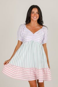 With a regal presence and vibrant print throughout, the Just Lovely Multi Striped Color Block Babydoll Mini Dress! Featuring playful stripes in a mix of purple, green, pink, and white, this dress brings a fresh burst of color to your everyday style. The relaxed fit and lightweight fabric make it an easy choice for warm days, while the eye-catching print adds a fun twist to any outfit. Pair it with heels or sandals for a look that’s as lively as you are! Lightweight Cotton-Blend Fabrication Colorful Striped Color Block Print Sweetheart Neckline Elastic Shoulders Short Puff Sleeves with Elastic Cuffs Flowy Babydoll Fit Ruffle Hem Back Zipper Short/Mini Length Lined Body, Unlined Sleeves Self: 75% Cotton, 25% Polyester Lining: 100% Polyester Hand Wash Cold, Hang or Line Dry Models are 5’4″ and are wearing a Small.Garment Measurements in Inches:Small | Bust 32″ | Waist 34″ | Hips 44″ | Length 31″Medium | Bust 34″ | Waist 36″ | Hips 46″ | Length 32″Large | Bust 36″ | Waist 38″ | Hips 48″ | Length 33″