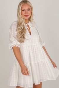 Whimsical and effortlessly elegant, the Reason To Love White Eyelet Tiered Mini Dress is just what you need to leave everyone easily impressed! Crafted from crisp white eyelet fabric, this dress features a flattering tiered silhouette that adds gentle volume and movement. The mini length keeps it playful, while the eyelet detailing brings timeless charm. Whether you’re heading to a picnic, brunch, or beach stroll, this breezy beauty is your go-to for effortless elegance! Lightweight Cotton Fabrication Eyelet Details Notched V-Neckline with Functional Tie 3/4 Length Flounce Sleeves with Elastic Cuffs Flowy Tiered Fit Short/Mini Length Lined Body, Unlined Sleeves Self: 100% Cotton Lining: 100% Rayon Hand Wash Cold, Lay Flat to Dry Model is 5’6″ and wearing a Small.Garment Measurements in Inches:Small | Bust 34” | Waist 36” | Hips 40” | Length 31”Medium | Bust 36” | Waist 38” | Hips 42” | Length 32”Large | Bust 38” | Waist 40” | Hips 44” | Length 33”