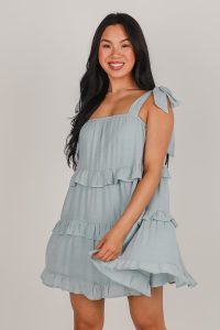 You’ll be doted on all night long when you’re wearing the Wonderful Thoughts Tiered Mini Dress! Designed for sunny days and carefree vibes, this dress features soft, layered ruffles that create a flowy and feminine silhouette. The adjustable tie straps add a sweet, customizable touch while offering the perfect fit. Light and breezy, this mini dress is ideal for warm-weather outings, from brunch dates to beach strolls. Just add sandals and a smile for an effortlessly cute look! Available in 2 colors. Lightweight Woven Knit Fabrication Elastic Square Neckline Functional Tie Straps Flowy Tiered Ruffle Fit Short/Mini Length Fully Lined Self + Lining: 100% Polyester Hand Wash Cold, Line Dry Models are 5’4″ and are wearing a Small.Garment Measurements in Inches:Small | Bust 32” (Stretches up to 38″) | Waist 36” | Hips 42” | Length 33”Medium | Bust 34” (Stretches up to 40″) | Waist 38” | Hips 44” | Length 34”Large | Bust 36” (Stretches up to 42″) | Waist 40” | Hips 46” | Length 35”